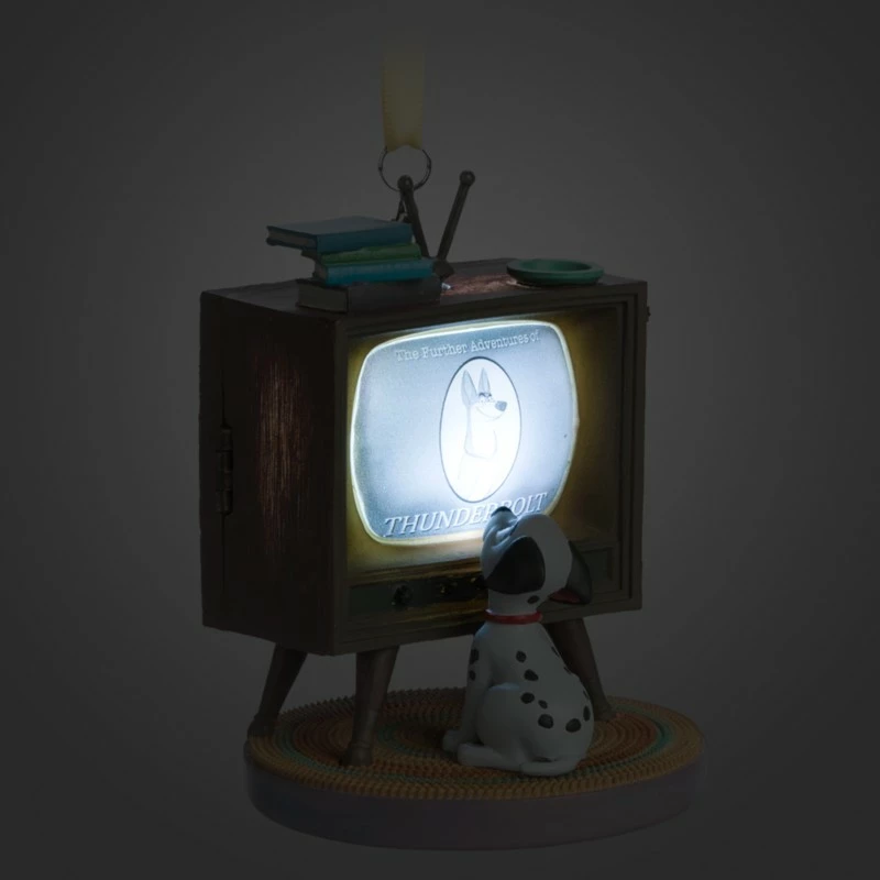 Lucky sits transfixed by his favourite TV show The Further Adventures of Thunderbolt in this delightful light-up ornament with sound that’s inspired by Disney’s One Hundred and One Dalmatians. The detailed figural ornament features the little pup and a TV with a screen that actually lights up, adding a warm glow to your holiday decor.
