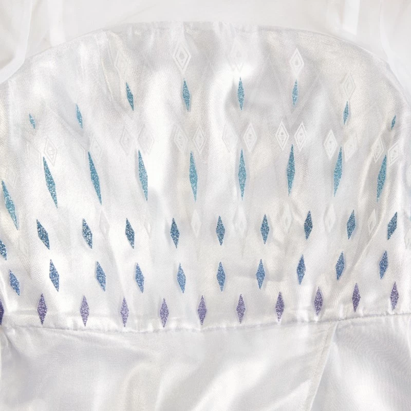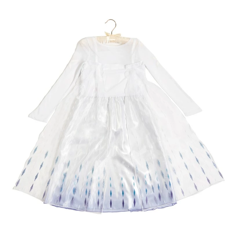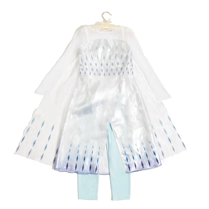 Let little ones channel the Snow Queen and rule the forest in this Elsa costume! The enchanting two piece design features a beautiful dress with a split organza cape, and a pair of pale blue trousers.