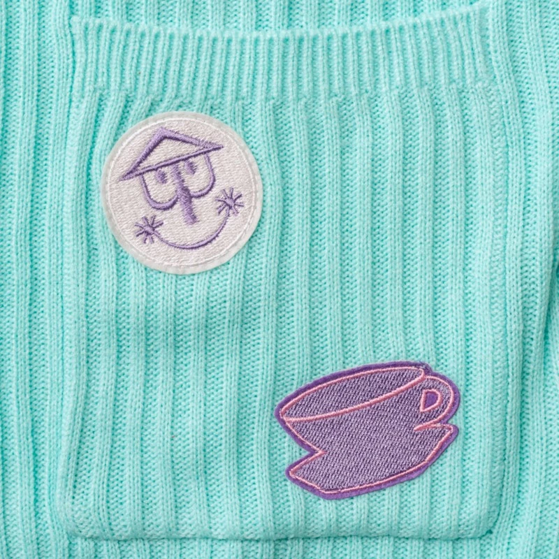 - 3 patches on pockets: a small world clock patch, a teacup patch, and a castle shield patch