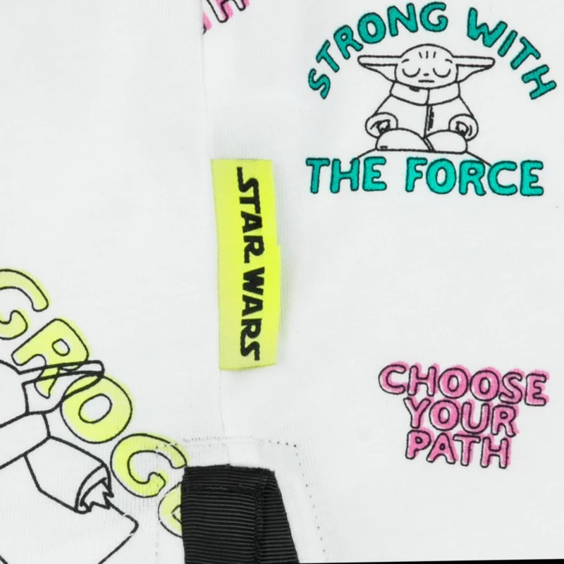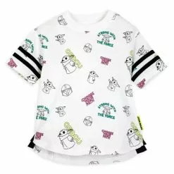 Choose your path wisely and include this sporty ”Baby Yoda” tee for their clothing collection. Grogu offers cosmic insight to Star Wars fandom from his jersey knit perch.