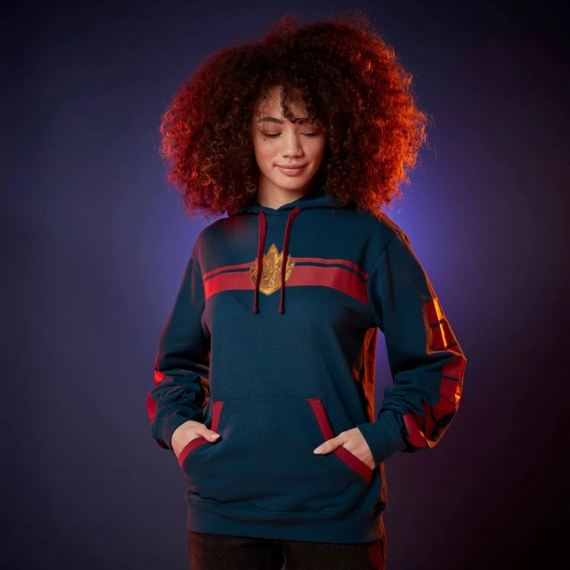 A truly iconic outfit, this pullover hoodie features a golden Guardians of the Galaxy symbol front and centre. The bold geometric design across the chest and along the sleeves befits the tough team led by the fearless Star-Lord. With its lined hood and fleece fabrication interior, this blended cotton top will quickly become a warm favourite.