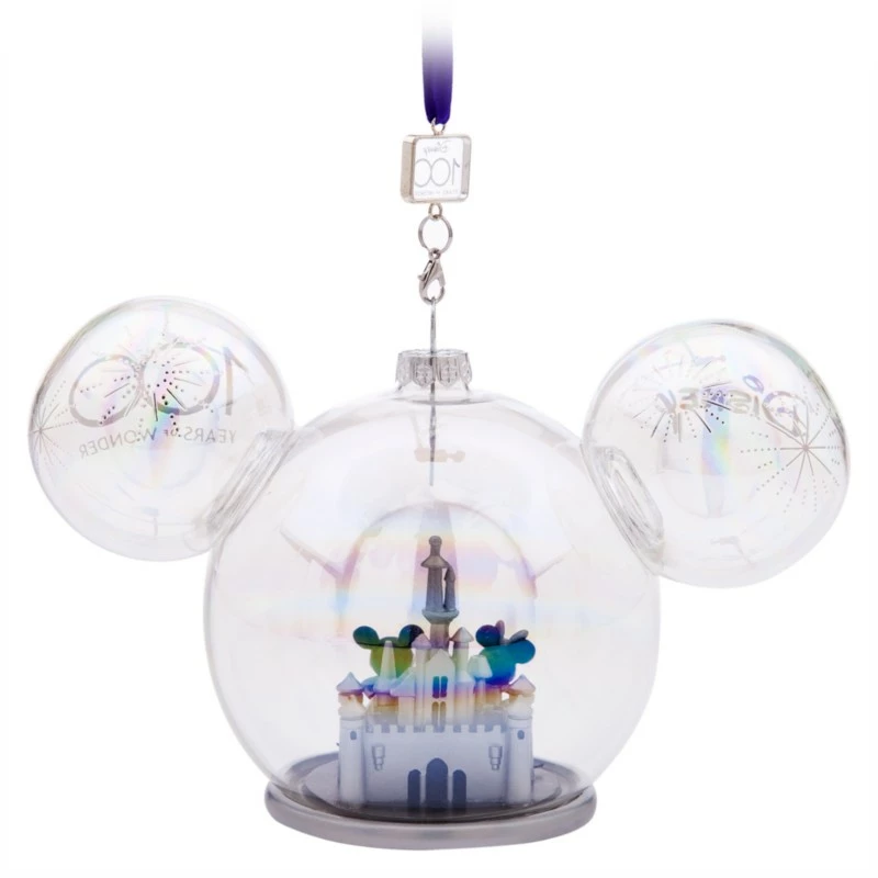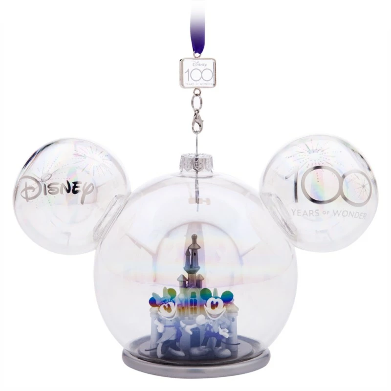 A gleaming, mouse-eared glass ball ornament sets the stage for miniature Mickey and Minnie figurines and a sculpted Sleeping Beauty Castle with a sparkling ”platinum” finish. This fittingly fanciful nod to our Disney100 celebration will be a family keepsake for the ages.