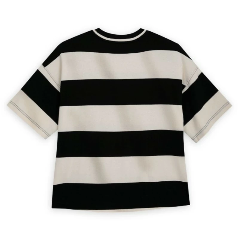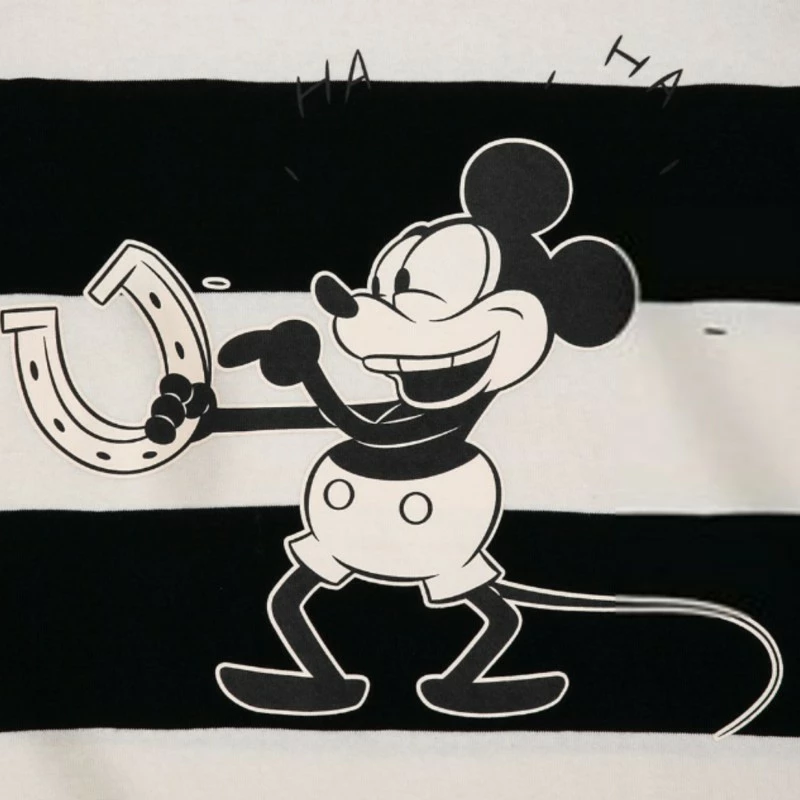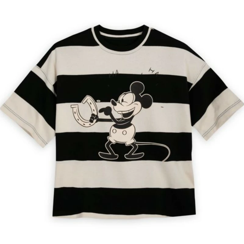 Mickey swings a horseshoe for good luck in this vintage pose from Plane Crazy and a striped oversize tee.