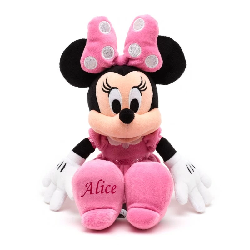Oh my! Let Minnie Mouse join you on mouseketeering adventures with our large plush! The charming mouse wears a pretty pink dress, complete with matching shoes and an over-sized bow.