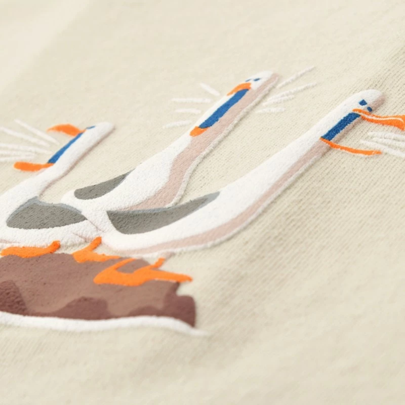 - Puff ink screen print of three seagulls on rock at front right chest of shirt